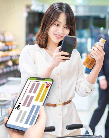 現在位置表示機能を使って商品ナビを実装すれば、現在地から目的地までのルート表示が可能。店舗内で迷わず、お買い物が快適になります。